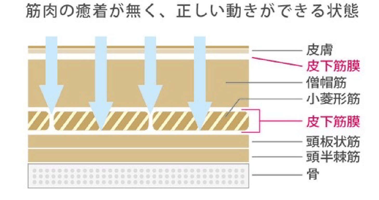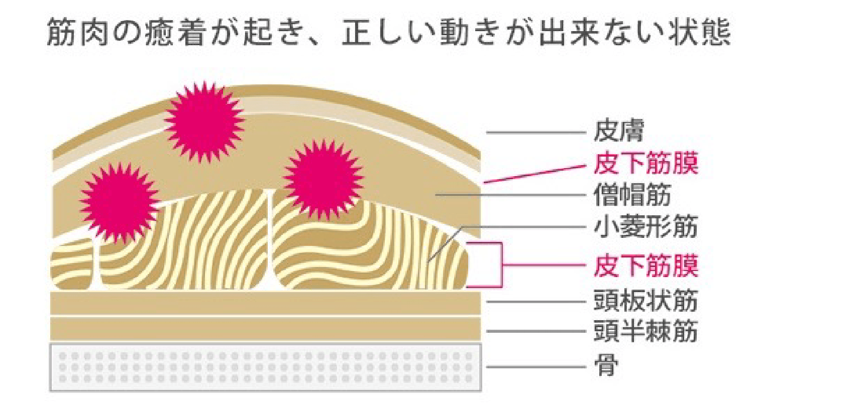 同じ動作・同じ姿勢を長時間続けると、血流が悪くなり筋肉の癒着が起きます。